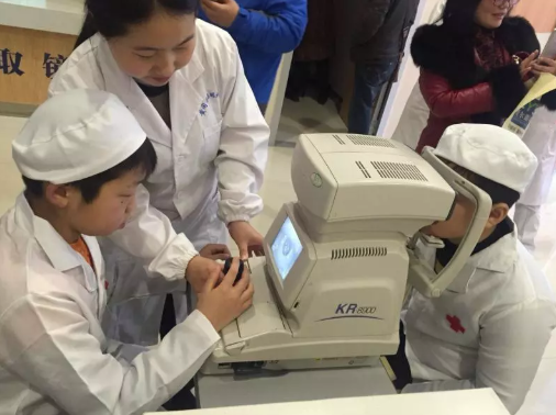 2、参加活动的小读者进行“我是小小眼科医生”体验。 主办单位:黄冈市爱尔眼科医院