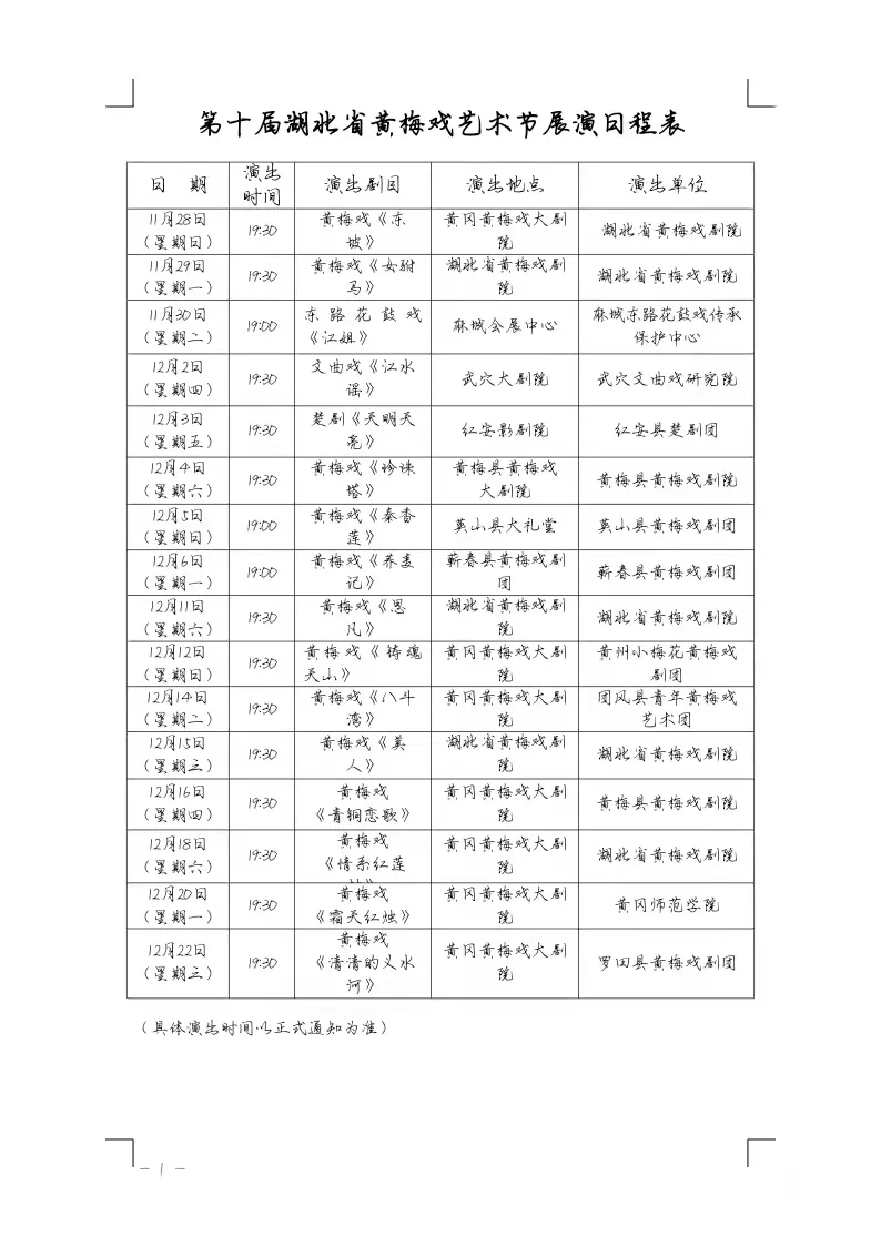 11月28日至12月22日,在黄冈城区和相关县市,开展新创黄梅戏剧目和其它地方戏剧目、经典传统戏剧目演出。