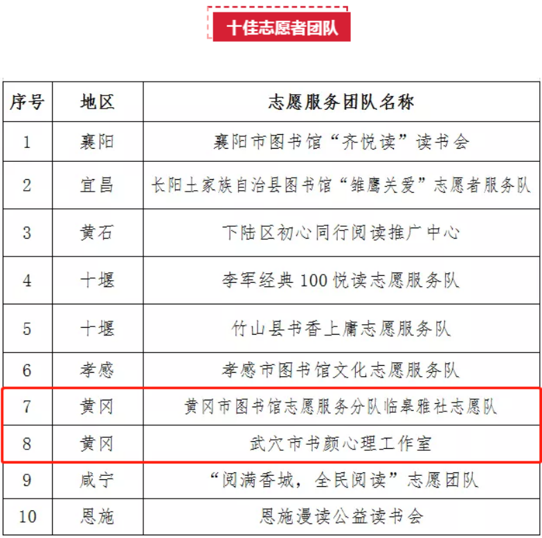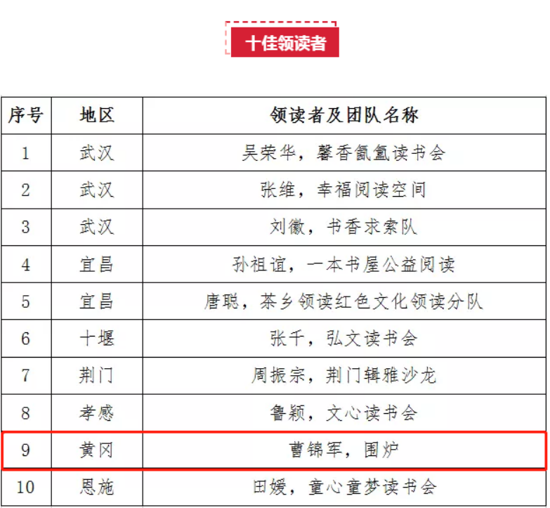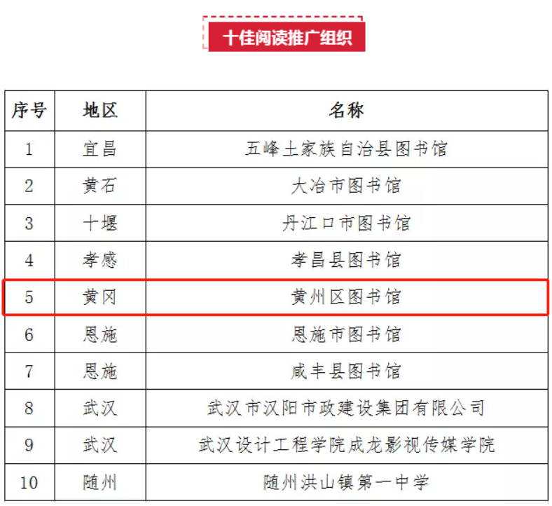 黄冈市揽获5个奖项,其中黄冈市图书馆获得“十佳组织单位”称号,黄冈市内区县公共图书馆和个人共获得4个奖项。共有8名阅读爱好者获聘长江读书节领读者称号。
