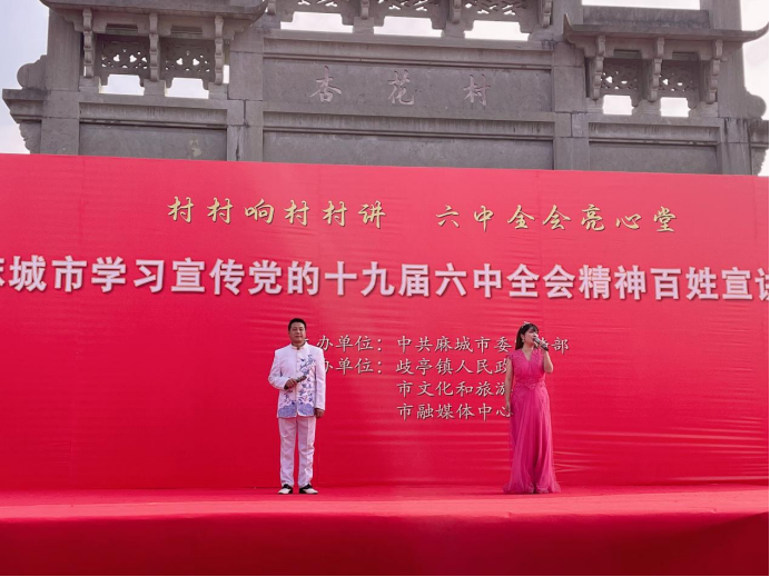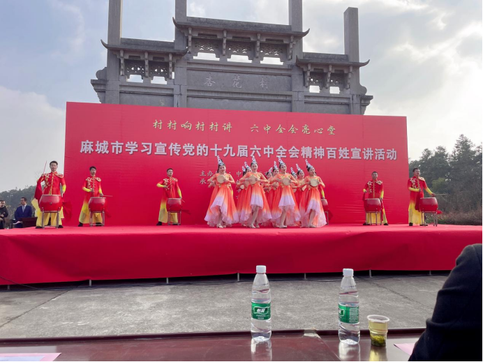 12月14日下午,由中共麻城市委宣传部主办,岐亭镇人民政府、麻城市文化和旅游局、麻城市融媒体中心承办的“学习宣传党的十九届六中全会精神百姓宣讲活动”在麻城市歧亭镇杏花村党群活动中心广场顺利开展,村民们聚集到这里欣赏舞蹈、大鼓、歌曲、戏曲等节目,活动现场热闹非凡。
