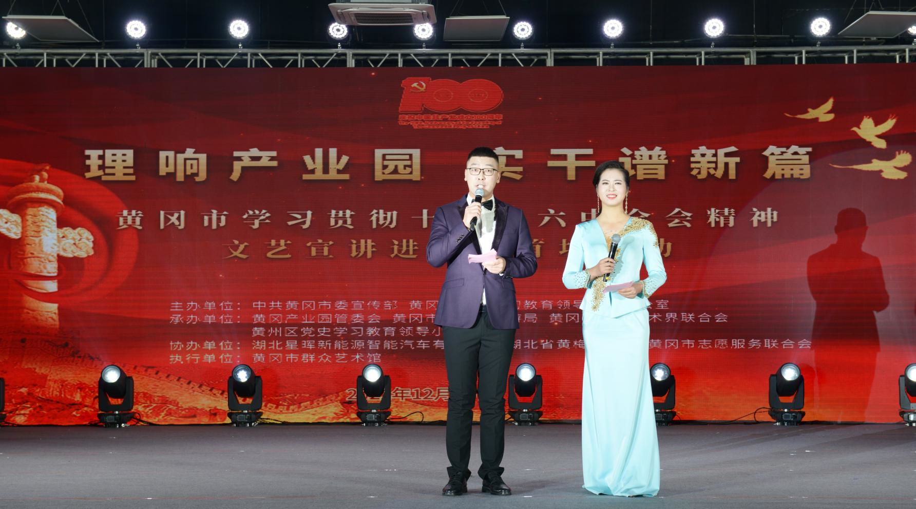 12月24日晚,黄冈市产业园湖北星晖新能源智能汽车有限公司职工活动中心,人声鼎沸,歌舞飞扬。由中共黄冈市委宣传部、黄冈市党史学习教育领导小组办公室主办,黄冈产业园管委会、黄冈市文化和旅游局、黄冈市文学艺术界联合会、黄州区党史学习教育领导小组承办,湖北星晖新能源智能汽车有限公司、湖北省黄梅戏剧院、黄冈市志愿服务联合会协办,黄冈市群众艺术馆执行的“理响产业园 实干谱新篇”黄冈市“红色文艺轻骑兵”学习贯彻十九届六中全会精神文艺宣讲进园区活动在这里隆重举行。市委常委、市委宣传部部长李初敏,市委常委、市委组织部部长何飞,市委常委、常务副市长刘忠诚,副市长潘国林,黄州区委书记夏志东及市直部门主要负责人,湖北星晖新能源智能汽车有限公司领导及员工约500人现场观看聆听文艺宣讲活动。著名黄梅戏表演艺术家张辉携省黄梅戏剧院实力演员,著名青年歌唱家万莉及学生友情出演,助力文艺宣讲活动。截止发稿前,线上线下观看人数达40多万人次。