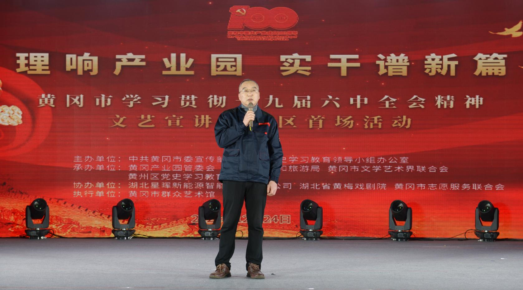 湖北星晖新能源智能汽车有限公司总经理许先中联系企业实际,喜谈黄冈营商环境大变化,畅想企业美好未来。本次活动既有精彩的文艺演出,又有深入浅出的理论宣讲,进一步增强了园区企业职工的干劲和与企业同命运、共患难的信心和决心。
