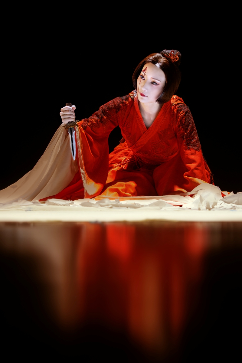 《美人》以“美”为线索,演绎“倾月貌、孝子心、忠义肠、爱无敌”的貂蝉与吕布、董卓以及其义父王允之间的爱恨情仇,表达“唯有爱和美,才能治愈一切”的观念。这个剧目以小剧场戏剧样式呈现,阵容虽小,可演员的戏份一点都不少,剧中貂蝉的扮演者谢思琴几乎没有幕间喘息的时间,近两个小时的演出一气呵成,再加上一人两面的切换,表演难度极高,要求演员在跌宕起伏的剧情中对爱恨交织的情绪要有准确的把控能力。