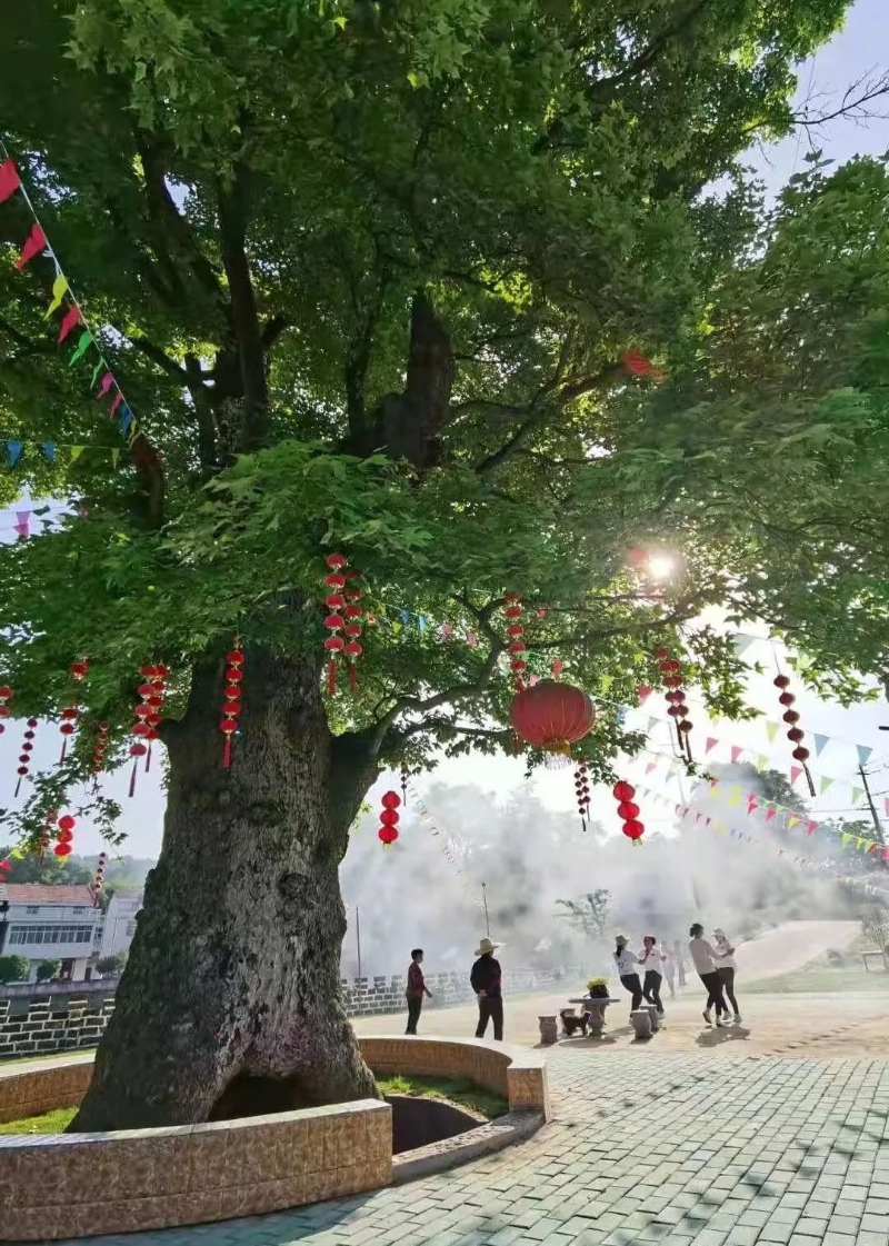 此树为明朝末年(公元1500年)熊氏迁居后所植,挺拔雄伟,枝繁叶茂,像一个顶天立地的巨人,又像一个威武的哨兵,粗大笔直的树干直插云霄,一簇簇红色的枫叶,像一团火焰照亮了整个村庄。