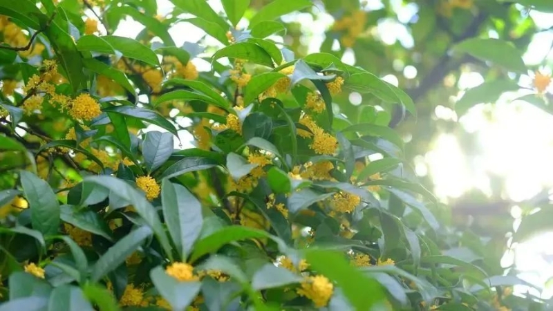 这棵古桂花树,已有600余年的树龄,枝繁叶茂,树干挺拔,一串串小金铃似的小花在绿叶的衬托下显得异常美丽。那花密密麻麻,一簇连着一簇,在阳光下,闪烁着金色的光芒,特别耀眼,特别芬芳。