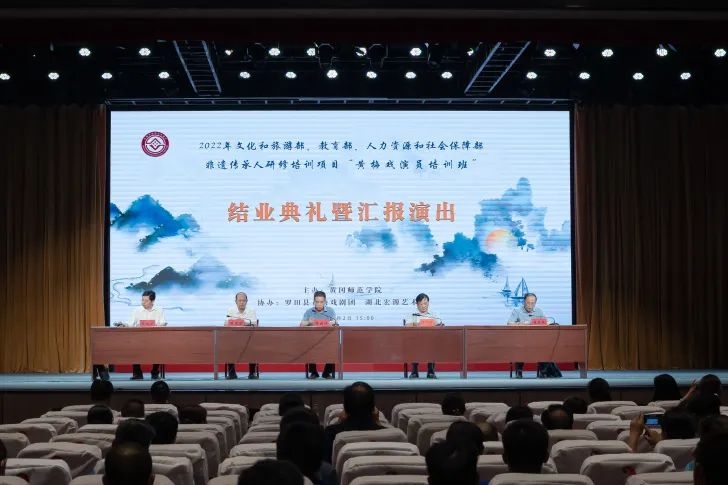 8月2日下午,2022年文化和旅游部、教育部、人社部非遗传承人研修培训项目“黄梅戏演员培训班”结业典礼暨汇报演出在湖北宏源药业职工活动中心举行,来自省、市、县领导、专家、教授与宏源公司工友们一起观看了演出。