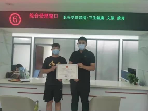 8月12日,麻城市浪尖游泳健身中心法人在政务服务中心文旅窗口领取了高危险性体育项目(游泳)的行业综合许可证。