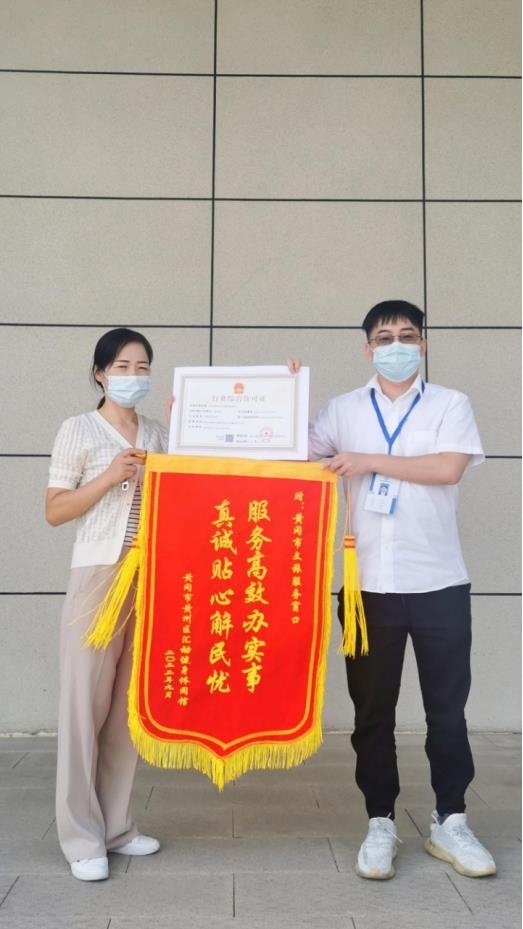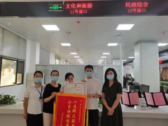 9月8日下午,在黄州区行政服务大厅,黄州区文化和旅游局、黄州区政务服务和大数据管理局以及文旅窗口工作人员一起,将我市区首张文旅行业综合许可证发放到黄州某健身娱乐馆业主手中,这是黄冈市区发放的首张文旅行业综合许可证,满心喜悦的业主同时为市、区文旅局送上了两面包含心意的锦旗。
