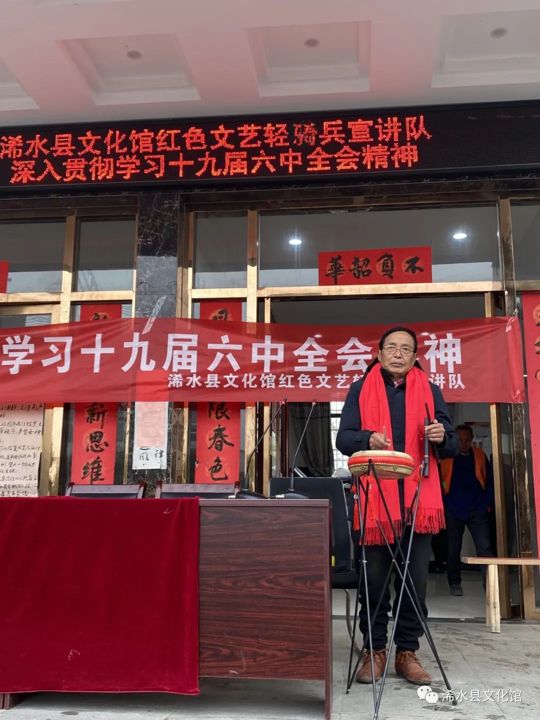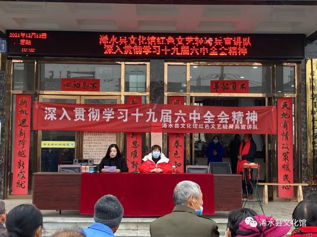 浠水县文化馆响应中央的号召,积极宣传贯彻党的十九届六中全会精神,计划12月中旬至元月底在驻点村及十二个乡镇巡回宣讲,预计宣讲13场,并于2021年12月13日,组织红色文艺轻骑兵宣讲队先后到丁司垱镇郭毛岭村和孟家冲村以快板、鼓书、文稿的形式进行宣讲,本次活动有三百多人参加。