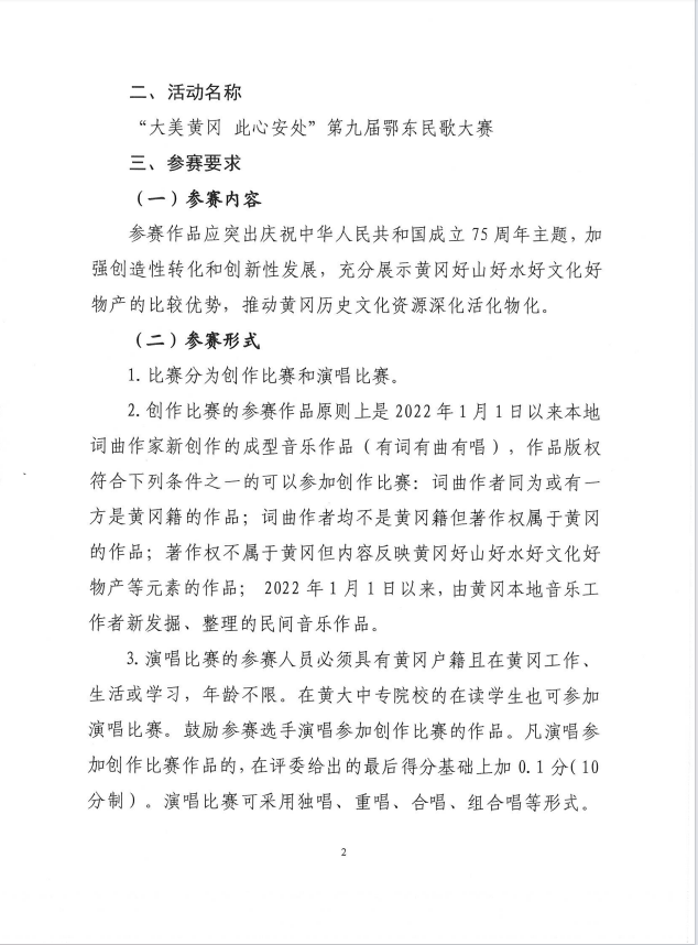 热爱民歌民乐、乐于创作的“音乐迷”们,不要错过今年的鄂东民歌大赛哦!征集的作品一旦被征用参加市里比赛,并获得奖项,根据获奖情况我们将给予奖金鼓励。参赛作品应突出庆祝中华人民共和国成立75周年主题,加强创造性转化和创造性发展,充分展示黄冈好山好水好文化好物产的比较优势,推动黄冈历史文化资源深化活化物化。