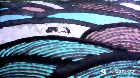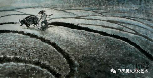 印象最深的是他画的《父亲》里面的牛与父亲的形象,他似乎站在更远更远的地方眺望田间,广袤的田野,视线中的父亲和牛显得很小,但正是这种参差对照,才能让人有瞬时的耳热眼热。你看到的不只是劳作的艰辛,还有人与自然的和谐共融。