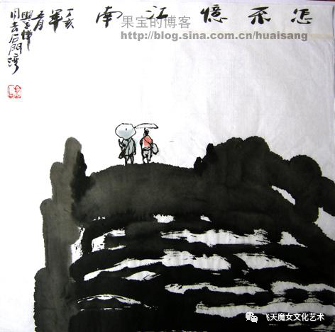 在王老眼里,凡事皆可入画,连他与老伴去浙江平湖拜谒“李叔同纪念馆”,去石门湾瞻仰丰子恺“缘缘堂”故居,都成为他创作的题材。《忆江南》的画面极为简约:江南的石板桥上,两个撑着油纸伞的人的背影,更为此次出行增添了几分诗意。依然是他的浓烈如洗的笔墨风格。那江南石桥的厚重全浓缩在他的粗笔重墨里,而那光与影的巧妙处理,则让人看到了打湿桥面的雨。什么都有了,然而你似乎什么也没看到,这就是艺术的最高境界,该隐藏的该凸显的,均站对了位。其用笔、用墨、用色极简,可谓大道至简、大象无形。