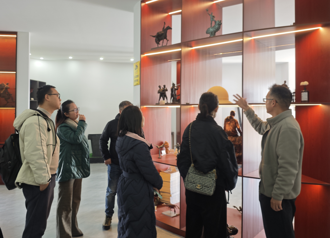 浠水泥塑非遗馆于 2024 年 11 月正式对外开放,一楼集中陈列泥塑、铜像、石雕等多元材质作品,其中《红军东征交响曲》大型雕塑、“三百六十行” 铜像模型等作品,保留了传统技艺内核,并融入了红色文化、民俗文化元素。二楼陈列精品木雕作品,造型精巧灵动、惟妙惟肖,既满足了当代艺术的审美需求,又实现了传统与现代的融合,兼具 “神形兼备、稳重大方” 的地方特色。调研过程中,朱一林向领导一行汇报了浠水泥塑的传承脉络与发展成果:该技艺起源于清代晚期兰溪镇袁龙村叶氏家族,经多代艺人口传身授形成独特风格,2024 年12月成功入选湖北省第七批省级非物质文化遗产代表性项目。近年来,在县文旅局专项补助及政策支持下,传承团队将技艺转化为产品,目前相关作品、产品已经成为湖北、江苏、内蒙、青海、甘肃、重庆等地的雕塑界有影响力的品牌,为非遗活化积累实践经验。领导一行听取讲解后,对浠水泥塑守正创新的发展路径给予肯定。同时强调,要进一步加强非遗保护与活化利用,推动泥塑技艺与现代审美相结合,探索开发具有浠水特色、贴近市场需求的文创产品,让非遗更好地融入当代生活,为全县文旅产业发展注入文化动能。