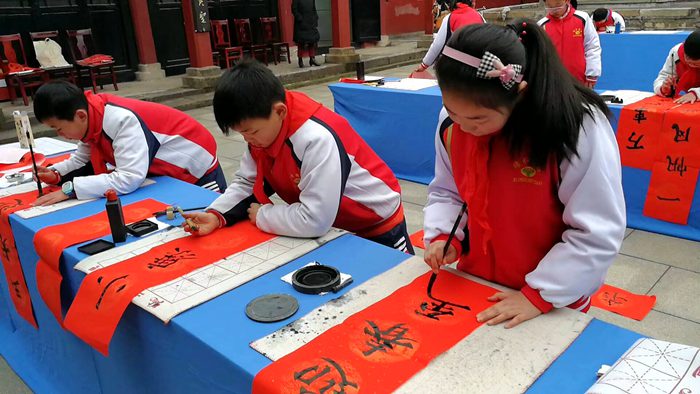 尽管天气十分寒冷,文庙小广场旁边还覆盖着一层霜花,但也没能削减现场书写春联的热闹气氛。小“书法家”分三排摆开,画面温馨和谐,仿佛一番较量,更是一场文化的传承。行云流水之间,一幅幅春联便被书写出来,写好的春联随后被悬挂在门楹两侧,提前为博物馆增添了年味。“书法家”们气定神闲,一丝不苟,一笔一划尽显风采;学生们目光炯炯,姿势端正,一撇一捺笔底春风。大成殿前,红纸为底,黑墨为字,红漆黑瓦、飞檐木雕映衬下,似穿越千年,走入历史长河。