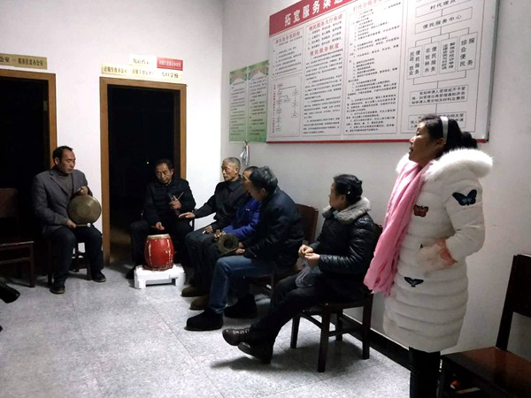 元月19日晚,罗田县凤山镇大人冲村村部,一阵阵锣鼓声、高亢的东腔戏声在严冬的夜风中奏响。大人冲村汉剧团二十余名东腔戏艺人在表演罗田东腔戏,罗田县文化馆非遗中心的工作人员抓紧时间对东腔戏一系列文武演唱情景进行录制。