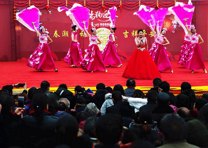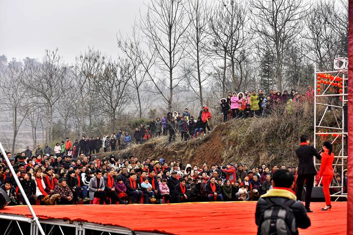 演出于下午14:30正式开始,身着轻薄纱衣的舞蹈演员和歌手们在寒风中冻得瑟瑟发抖,脸白唇青。年近60岁的老演员身着短袖草鞋上场,侧台候场的女演员们相互抱着取暖,可是一走上舞台,专业演员的素质与热情立即令她们忘却了寒冷,歌手们的声音依然是那么清亮动听,舞蹈演员的动作依然是那么优美舒展。在热烈的掌声中,演员们表演了鄂东夯歌《大力红安》、歌舞《我的红安我的梦》、小品《懒汉脱贫》、楚剧小戏《赶会》等节目,台下观众们个个笑逐颜开,不时响起阵阵热烈的欢呼声和呐喊声,台上台下一片欢腾,乡亲们看得如痴如醉。