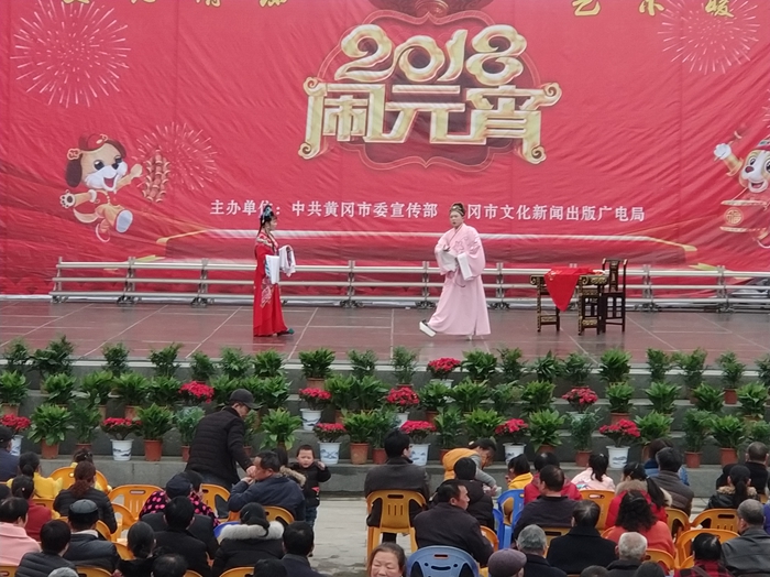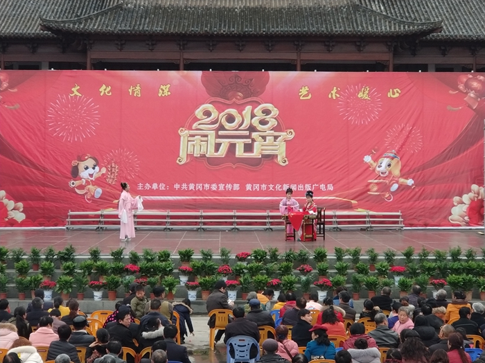 3月1日下午,遗爱湖公园东坡广场上人声鼎沸,锣鼓铿锵,由中共黄冈市委宣传部、市文化新闻出版广电局主办,市群艺馆、市博物馆、市图书馆遗爱湖风景区管理处、各县市区文化(文体、文广)局承办的正月十五闹元宵戏曲专场在这里鸣锣开演。市文广局党组书记、局长王建学,党组成员、副局长王宝超,公共文化科科长周良才和现场几千名观众一起观看了演出。