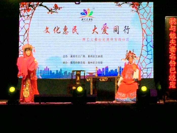此次活动共有十二个节目,演出在古装戏曲小品《皇帝请安》的精彩表演中拉开帷幕。黄梅戏经典选段《黄州美景花烂漫》、《小辞店花开花放》等节目吸引了周围社区居民前来驻足观看。市群艺馆文化志愿者的吉他弹唱,萨克斯独奏等节目赢得了现场观众的阵阵叫好和热烈掌声。
