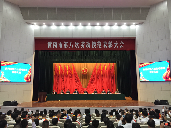 “五一”国际劳动节前夕,在雄壮的国歌声中,黄冈市第八次劳动模范表彰大会于2018年4月25日上午9时在职工活动中心隆重举行。100名贡献卓著的市级先进模范代表接受市委、市政府的表彰。