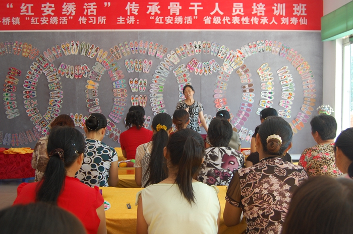 “红安绣活”代表性传承人刘寿仙,出身于刺绣世家,上下5代都擅长刺绣,13岁就师从姑母和母亲学习刺绣,15岁便能自画自剪自绣,20岁便成为当地绘画和刺绣能手,尤其擅长绘制和刺绣各类具有民间美术特色的图案,其作品工艺精湛、寓意深厚,其图案变幻有致、豪放浪漫,色彩明快清新、常将大红大绿大胆相配,凸显传统民族民间刺绣艺术的特色。