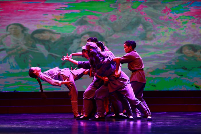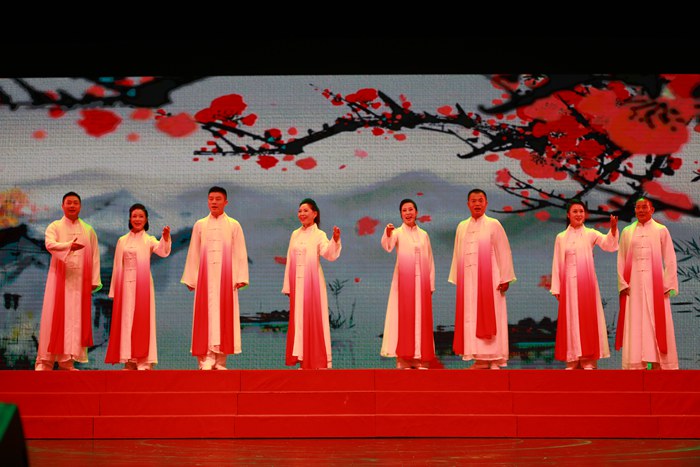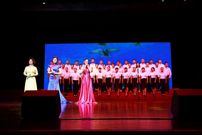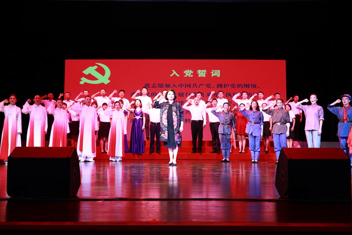 “天耀中华,天耀中华,风雨压不垮,苦难中开花……”晚上7点30,晚会在全体人员高唱《天耀中华》的歌声中拉开序幕。红色的歌词、红色的激情,一下子将人们的思绪带入那个特殊的年代,高亢的旋律扣动了每个歌者的心弦,掀起了晚会的第一个高潮,紧接着,震撼人心的《红灯记》选段、紧扣心弦的《智取威虎山》选段、激情澎湃的《弹起我心爱的土琵琶》、抒情豪迈的《党啊,亲爱的妈妈》、淳朴流畅的黄梅戏联唱《春色梨园一枝梅》、铿锵有力的《歌唱祖国》、深情壮美的舞蹈《八女投江》……一首首耳熟能详、荡气回肠的曲目,再现了不同时期火红的岁月,讴歌中国共产党带领中华民族从站起来到富起来再到强起来的丰功伟绩,整场晚会主题鲜明、形式丰富、内容新颖,当全体演员在台上庄严宣誓:“我志愿加入中国共产党……”时,台上台下人们都呛着泪水,激昂诵读。最后,当《没有共产党就没有新中国》熟悉的旋律在会场响起时,现场的气氛达到了高潮,台上的全体演员和台下领导与现场观众再次全体起立,一同合着节拍,放声高歌,台上台下情景交融。