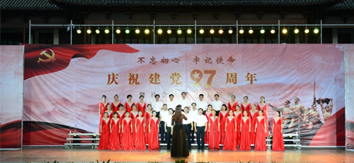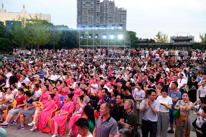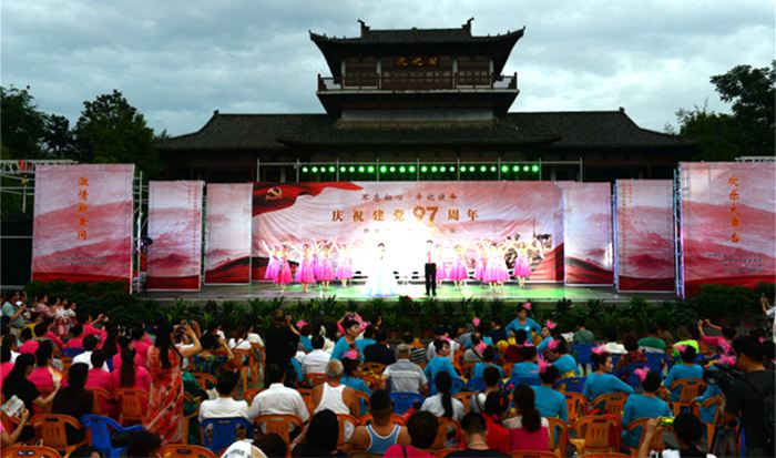 6月30日,由中共黄冈市委宣传部、黄冈市文化新闻出版广电局主办,黄冈市群众艺术馆、遗爱湖风景管理处、黄州区文化馆、湖北亮亮教育咨询有限公司承办的“不忘初心,牢记使命”庆祝建党97周年暨社会文艺团队展演活动在遗爱湖东坡广场举行。来自城区的14支社会文艺团队共17个节目参加了演出,晚会在群艺馆合唱班演唱的大合唱《没有共产党就没有新中国》中拉开序幕,铿锵有力的大合唱《保卫黄河》、轻盈妙曼的舞蹈《梨花颂》、活泼轻松的手鼓《手鼓声声传温情》、热情奔放的拉丁舞《棒棒棒》、婉转动听的黄梅戏《观灯,一月思念,风流美黄冈》等节目将晚会一次次推向高潮,优美的旋律,跳动的音符,多彩的舞姿,给现场观众带来视觉和听觉的美好感受,赢得了台下观众一阵阵热烈的掌声。