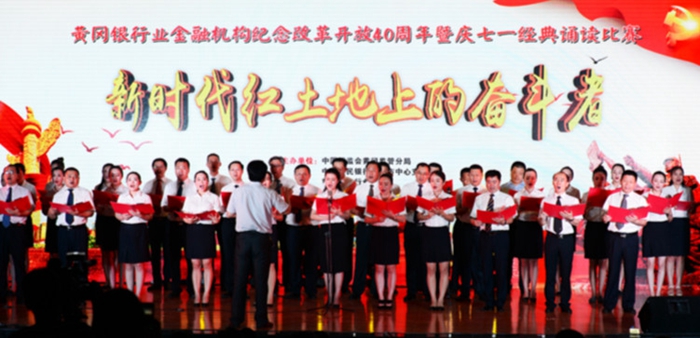 6月28日晚,由中国银监会黄冈监管分局、中国人民银行黄冈市中心分行、黄冈市银行协会主办,黄冈市银行团工委、黄冈市群众艺术馆承办的“新时代红土地上的奋斗者”黄冈银行业金融机构纪念改革开放40周年暨庆七一经典诵读比赛在市委党校报告厅举行。演出当晚,各支代表队以饱满的热情讴歌党的丰功伟绩,深刻再现了改革开放40年来金融行业的发展。整台晚会气氛热烈、高潮迭起,得到各级领导和现场观众的一致好评。