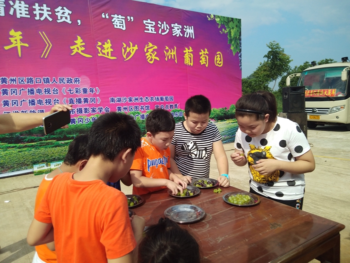放暑假了怎么过?宅在家还是去旅游?7月14日上午,为助力精准扶贫,丰富少年儿童暑期文化生活,路口镇人民政府联合黄州区图书馆、黄冈市摄影家学会、黄冈少年作家班等单位走进路口镇南湖沙家洲生态葡萄园,开展了一场别开生面的“萄”宝活动,并通过直播黄冈平台全程直播。黄州区文体新局党组书记局长杨平安百忙之中出席此次活动。