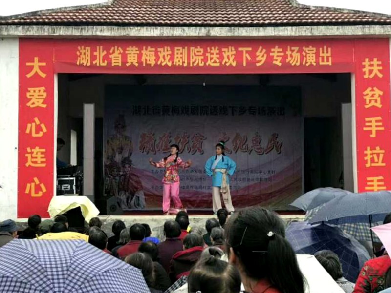 10月21日下午,冷雨淅淅,寒意袭人,在黄州区陈策楼镇程德岗村,省黄梅戏剧院的演员们正在冒雨为村民演出一台精彩的经典黄梅戏小戏。