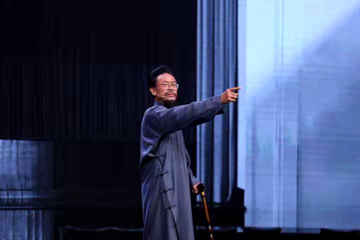 接着,配乐声响起,闻一多扮演者周佐平表演了《最后一次的演讲》,真实再现了闻一多先生拍案而起、悲愤激昂的英雄气概。讲解员蔡晓霞在舞台前侧红烛旁朗诵了闻一多诗《红烛》。