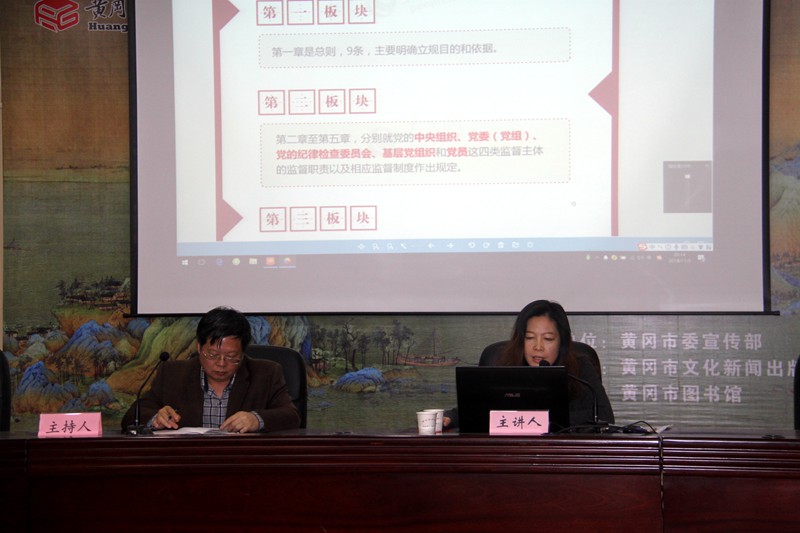 11月5日,市文广局在遗爱湖图书馆组织开展第16期干部夜校活动,按照会议议程,先后由法规科科长程春院讲授新时代法制建设务实、工会主席倪大鹏传达学习了扫黑除恶相关文件精神、党办主任吴雪晴解读《中国共产党党内监督条例》、市博物馆党支部书记张领领学《习近平新时代中国特色社会主义思想三十讲》第3、4讲。