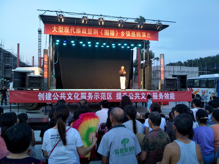 县楚剧团接到廉政教育演出专场演出任务后。他们组织演职人员发扬不怕吃苦,连续作战的精神,坚持下乡巡演。演员在台上摄氏近40℃的高温下,穿上冬天的棉衣演得是那么逼真、那么贴切,剧中情节深深打动每位观众。《围猎》上演让现场的党员干部,在轻松愉悦的氛围中接受了一次深刻的廉政教育。在场的党员干部纷纷表示要不忘入党宣誓时许下的誓言,清清白白做人,干干净净做事,用浩然正气筑起一道拒腐防变的钢铁长城。