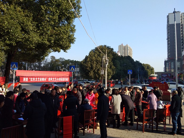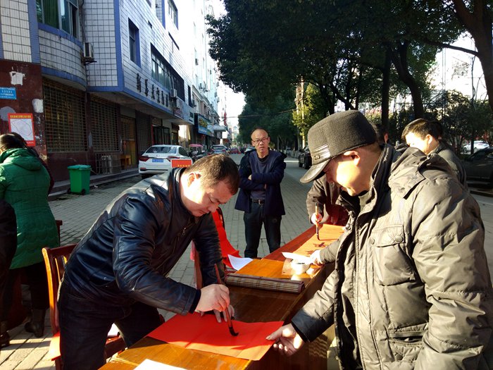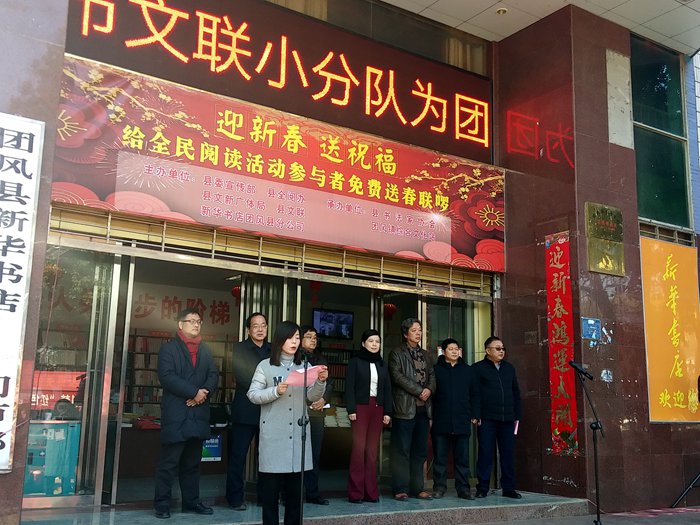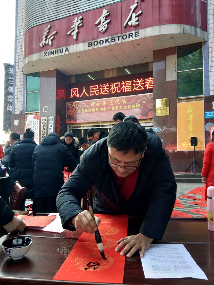 1月24日,由团风县委宣传部牵头组织,团风县全阅办、团风县文新广体局、团风县文联、湖北省新华书店(集团)有限公司团风县分公司联合主办;团风书法家协会、团风镇综合文化站承办的“迎新春 送祝福——向全民阅读参与者送春联"文化惠民活动在团风新华书店门前广场隆重举行,来自市县文联书法大家们挥亳泼墨或跌宕遒丽,为团风全民阅读参与者和市民免费书写赠送春联7OO余幅,得到社会各界好评。