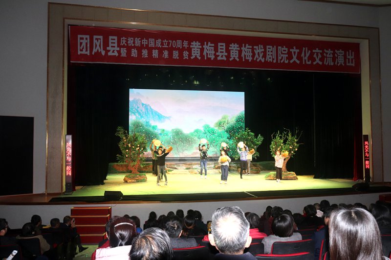 为庆祝新中国成立70周年,决战脱贫攻坚,弘扬优秀传统文化,丰富团风县人民群众精神文化生活,3月28——31日,黄梅县黄梅戏剧院受邀到团风县参加“庆祝新中国成立70周年暨助推精准脱贫”主题文化交流演出活动。