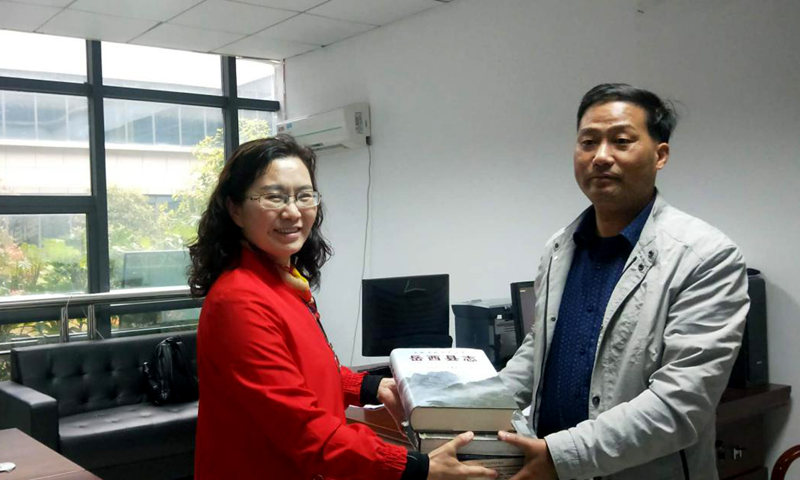 岳西县图书馆馆长万岳霞向红安县图书馆捐赠地方文献