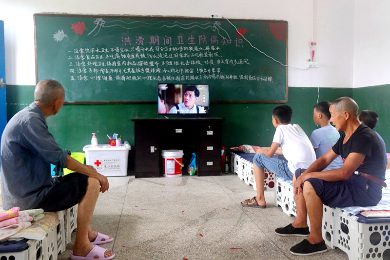 “我们这儿每个房间都安装了电视,大家除了可以看电视剧,还可以收看新闻”。负责大河镇袁山村临时转移安置点的镇干部胡火祥向我们介绍。