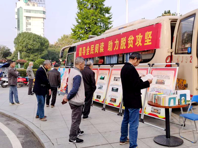县图书馆在天舒广场开展“倡导全民阅读、助力脱贫攻坚”流动图书车图书阅读及图片展览活动,为群众送去精神食粮。