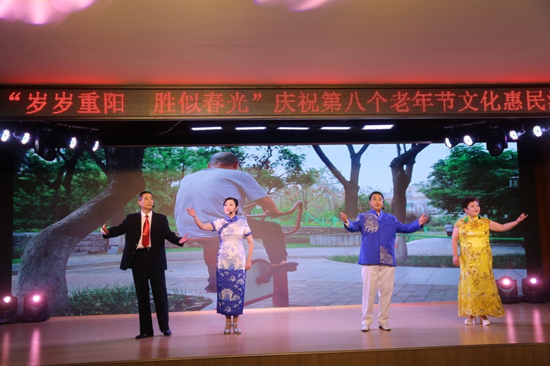 为贯彻国家、省、市有关文件精神,充分展示中老年人热爱生活、积极向上、与时俱进的精神面貌,进一步满足中老年人日益增长的精神文化需求,大力营造养老孝老敬老良好氛围。10月22日下午15:00点,由黄冈市卫生健康委员会、中共黄冈市委老干部局、黄冈市文化和旅游局主办,黄冈市老龄办、黄冈市群众艺术馆、黄冈市老年大学承办的“岁岁重阳 胜似春光”庆祝第八个老年节文化惠民演出活动在市群艺馆四楼多功能厅举行。