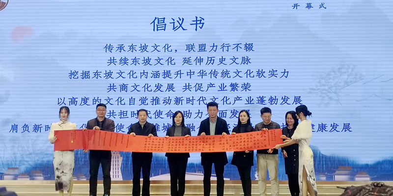 开幕式现场展示了中国民族书画院院长胡立新书写的“中国苏东坡品牌文化联盟”。随后,中书协会员,浙江省书协理事,金华市书协副主席钟国友挥毫书写的《传承东坡文化,联盟力行不辍——中国苏东坡品牌文化联盟倡议书》缓缓展开,七城市联合发出倡议:传承共续东坡文化,延伸历史文脉;共商文化发展,共促产业繁荣;共担时代使命,助力全面发展。沿着东坡足迹,共同见证中国苏东坡品牌文化联盟成立这一重要时刻。