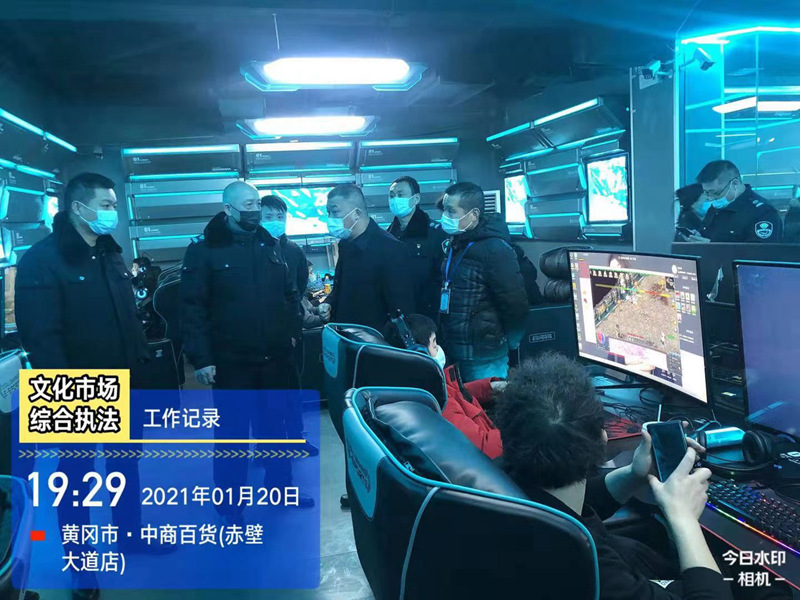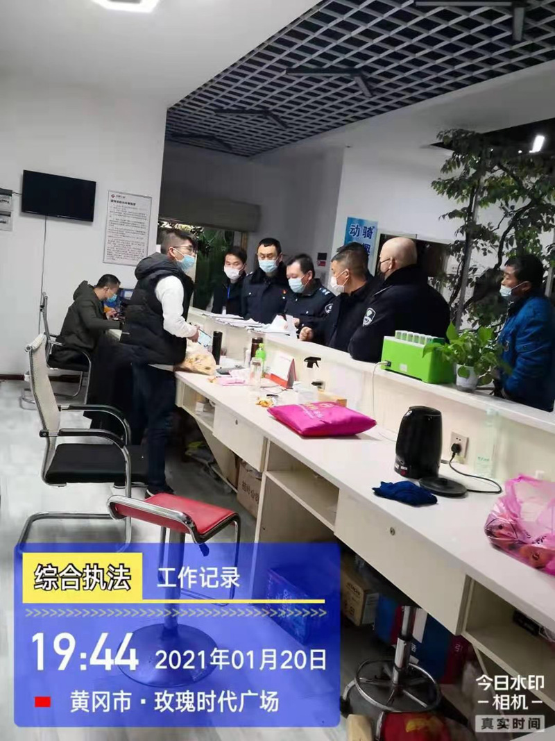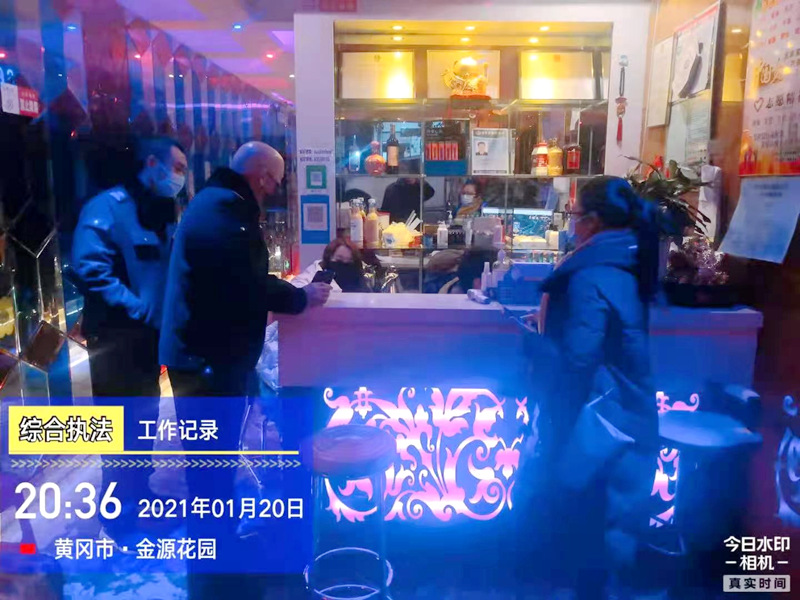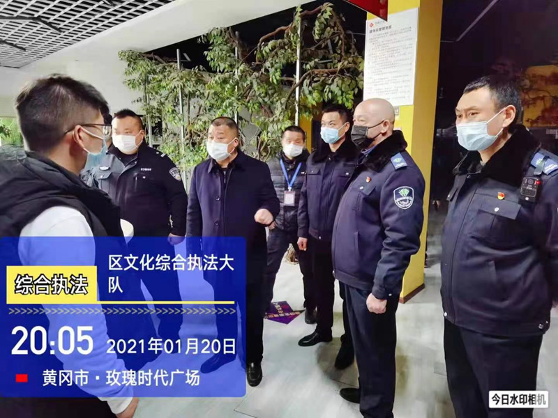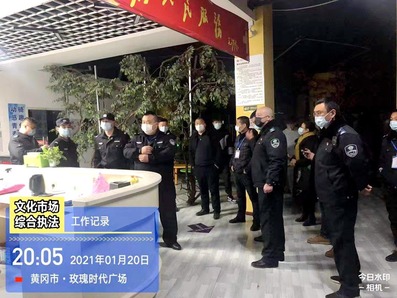 当前,面对境外疫情输入风险持续升温,国内出现多点散发及局部聚集性病例形势,根据《刘雪荣同志在全市疫情防控工作电视直播会议上的讲话》(黄防肺炎指发[2021]6号)文件精神,值此新春佳节来临之际,为巩固我市防控成果,给广大市民营造安定祥和的节日环境,黄冈市文化市场综合执法支队压紧压实文娱场所、文旅场所疫情防控主体责任,抓紧抓实防控措施,在黄州区防疫指挥部的统一部署安排下,联合区执法大队,集中力量,市区一体,联合行动,对网吧、KTV、酒吧、健身房、旅行社、影院等重点人群聚集场所、公共娱乐场所进一步加强疫情防控检查巡查,预防和降低人员密集场所防疫风险。