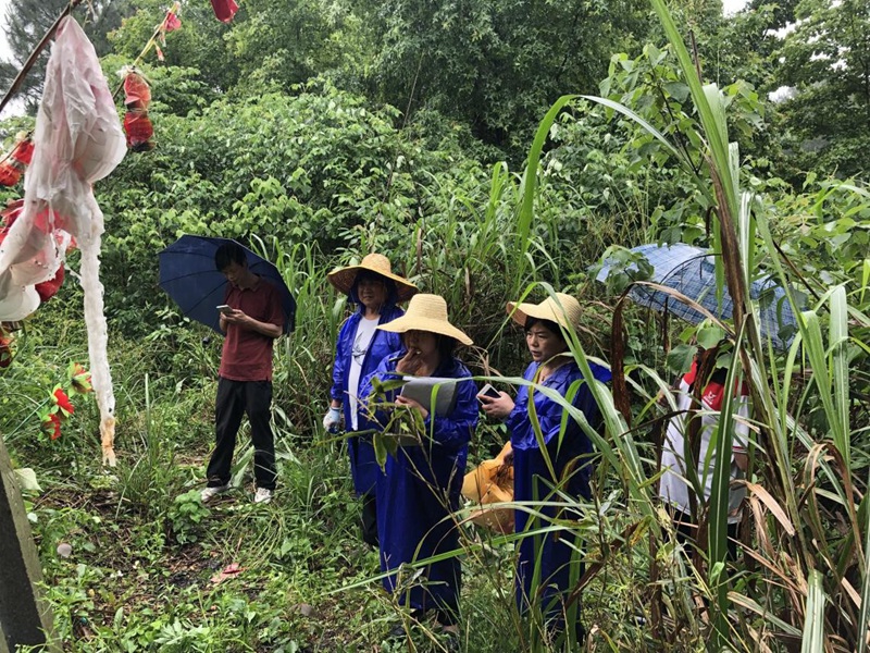 罗田县专班人员趁雨停间隙登山采集文物数据