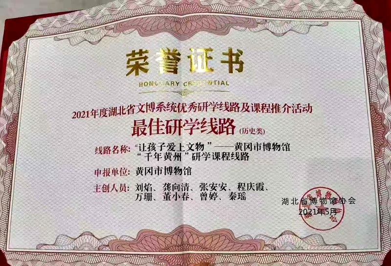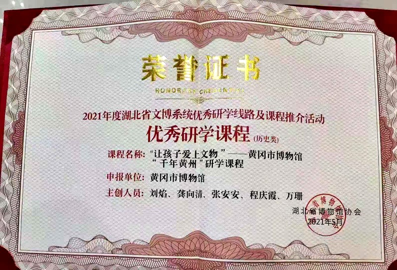 《“让孩子爱上文物”——黄冈市博物馆“千年黄州”研学课程》荣获2021年湖北省文博系统“优秀研学课程”。
