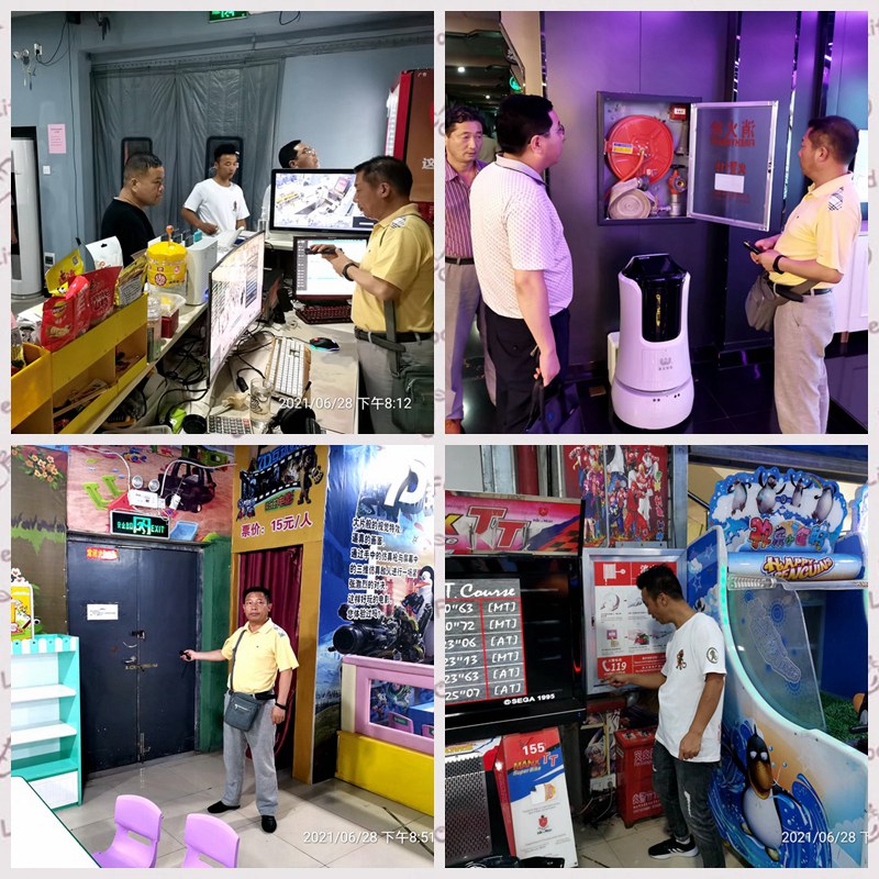 6月28日晚上,罗田县文旅局分管安全和执法副局长王新明带队,带领局行政审批股(安办)和执法大队人员检查了城区歌厅、网吧、影院、电子游艺厅消防安全,排查发现应急照明灯损坏,消火栓设备不全不能使用,常闭式防火门锁闭,灭火器配备数量不足等安全隐患。