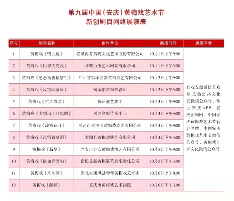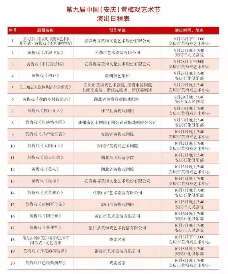 由文化和旅游部、安徽省人民政府主办,文化和旅游部艺术司、安徽省文化和旅游厅、安庆市人民政府承办的第九届中国(安庆)黄梅戏艺术节将于2021年9月26日至10月8日在安徽省安庆市举行。